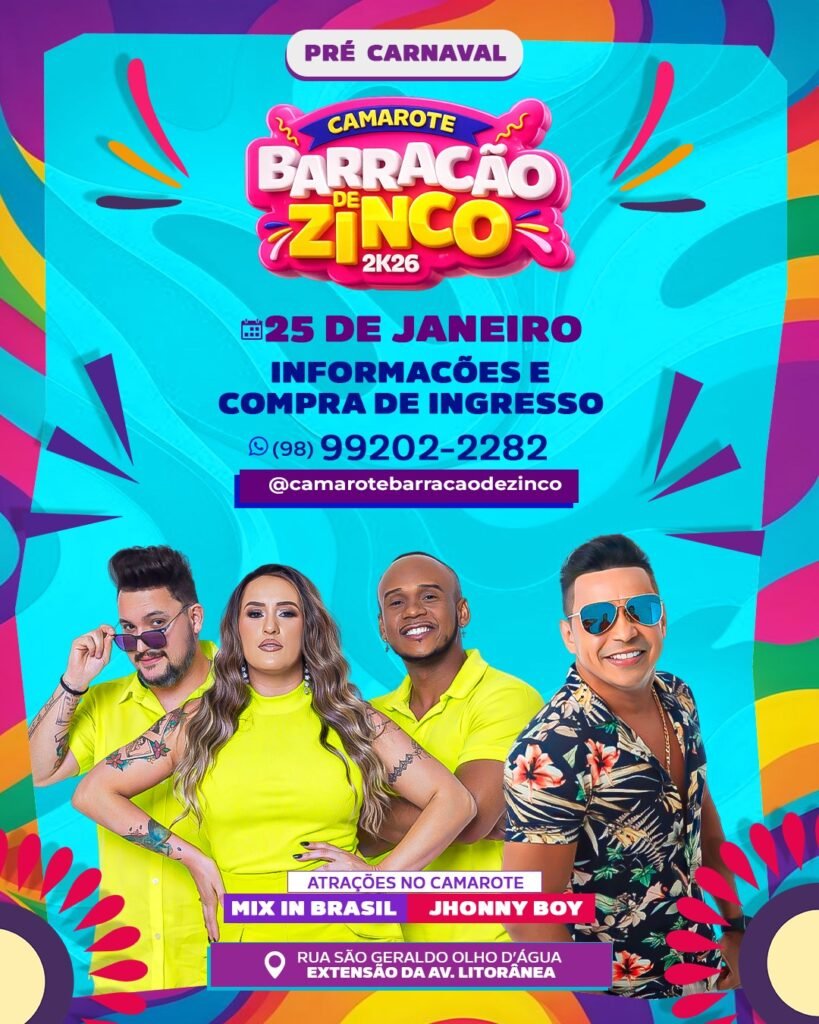 no BARRACÃO DE ZINCO, a animação fica por conta de Mix In Brasil e Jhony Boy, que prometem muita vibração, carisma e os maiores hits do momento, mantendo o clima de carnaval e garantindo a festa durante toda a noite.