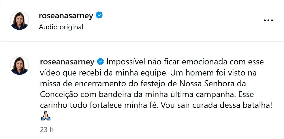“Impossível não ficar emocionada com esse vídeo que recebi da minha equipe. Um homem foi visto na missa de encerramento do festejo de Nossa Senhora da Conceição com bandeira da minha última campanha. Esse carinho todo fortalece minha fé. Vou sair curada dessa batalha!”